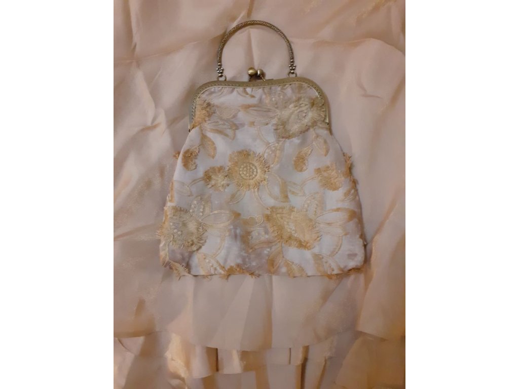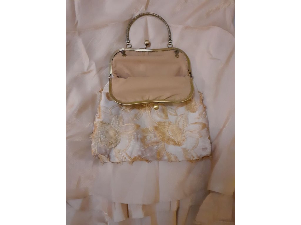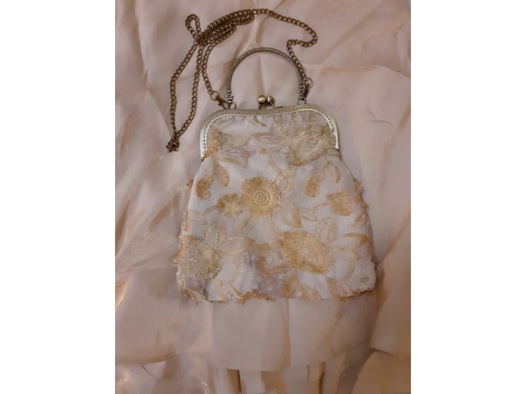 Smetanovo-zlatá rámečková kabelka vhodná na ples, na romantickou schůzku i do opery. Nechybí Klíč k romantice a malá kapsička na zrcátko. Dodáváno s řetízkem k nošení přes rameno.